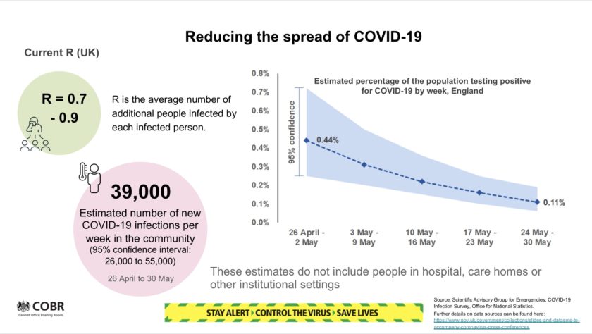 Ο ρυθμός μετάδοσης της νόσου (R) παραμένει μεταξύ 0,7 και 0,9, ενώ σύμφωνα με τις εκτιμήσεις της στατιστικής υπηρεσίας, 39.000 άνθρωποι προσβάλλονται από τον κορωνοϊό κάθε εβδομάδα.